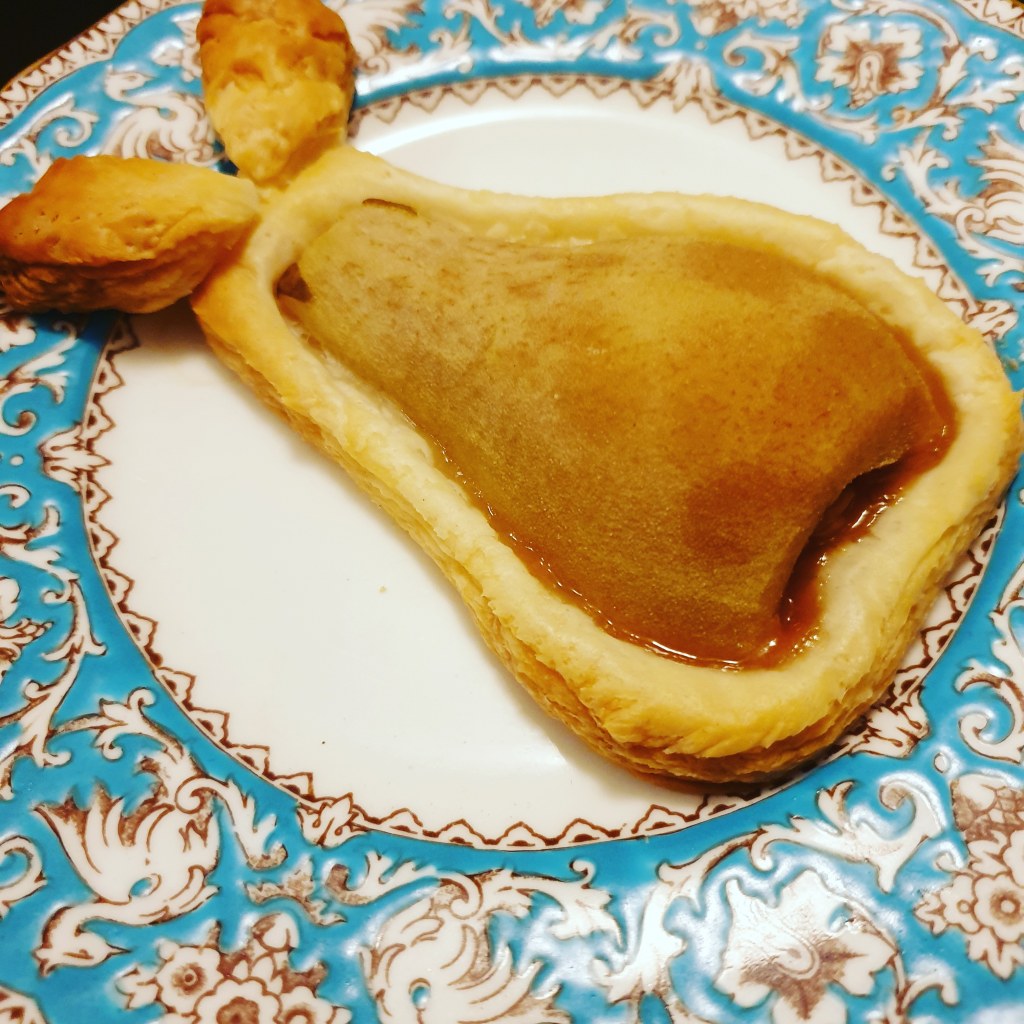 - With the scraps of pastry cut out leaf shapes and adore the pears (get as fancy as you like!)